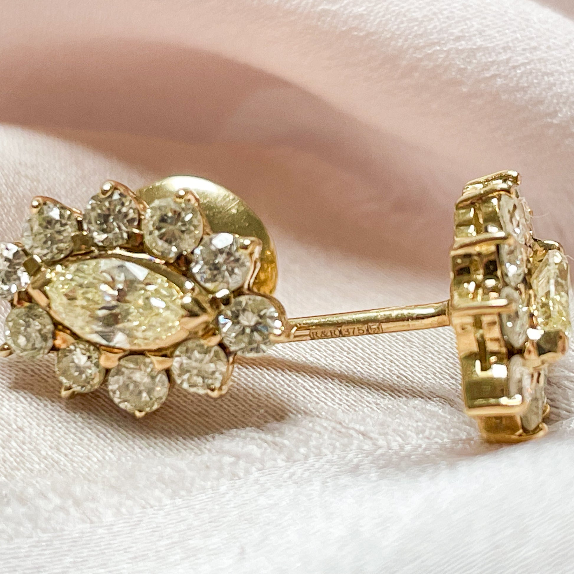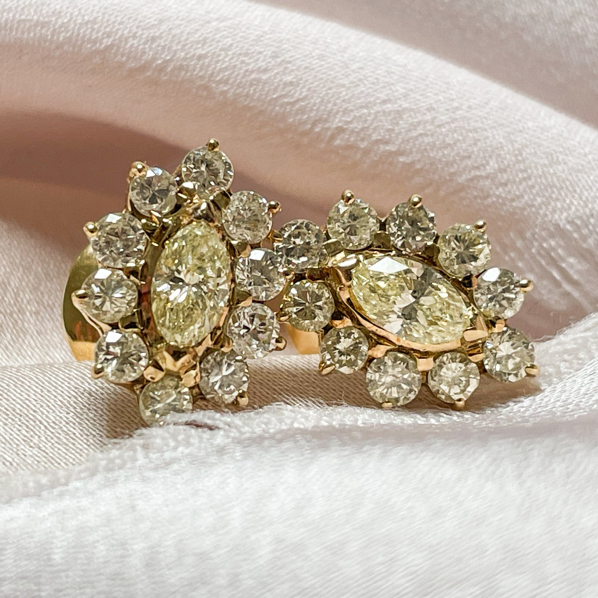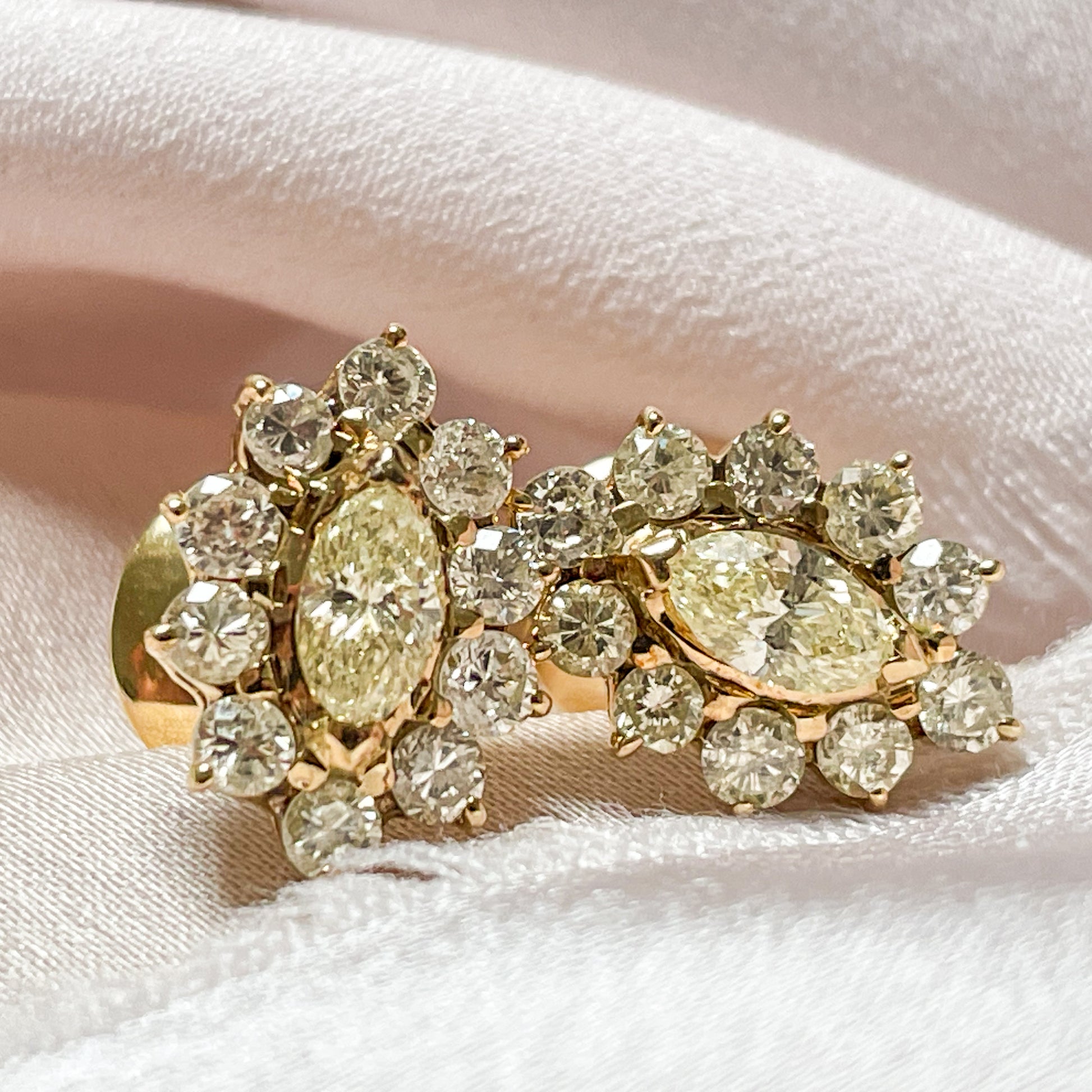 Each earring feels like a memento from a grander time. The marquise centre stones, with their elegant, elongated silhouette, lend a regal air, while the halo of brilliant rounds creates a soft, radiant shimmer, like starlight dancing on silk.