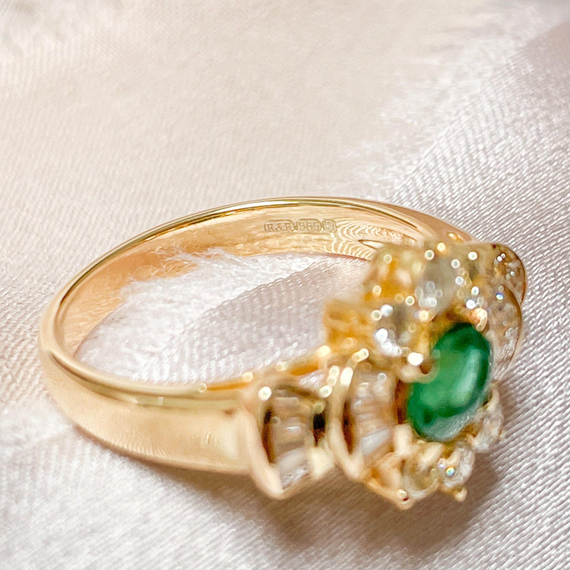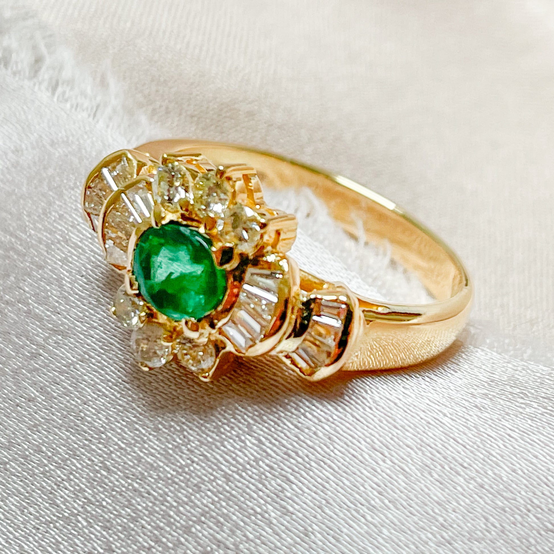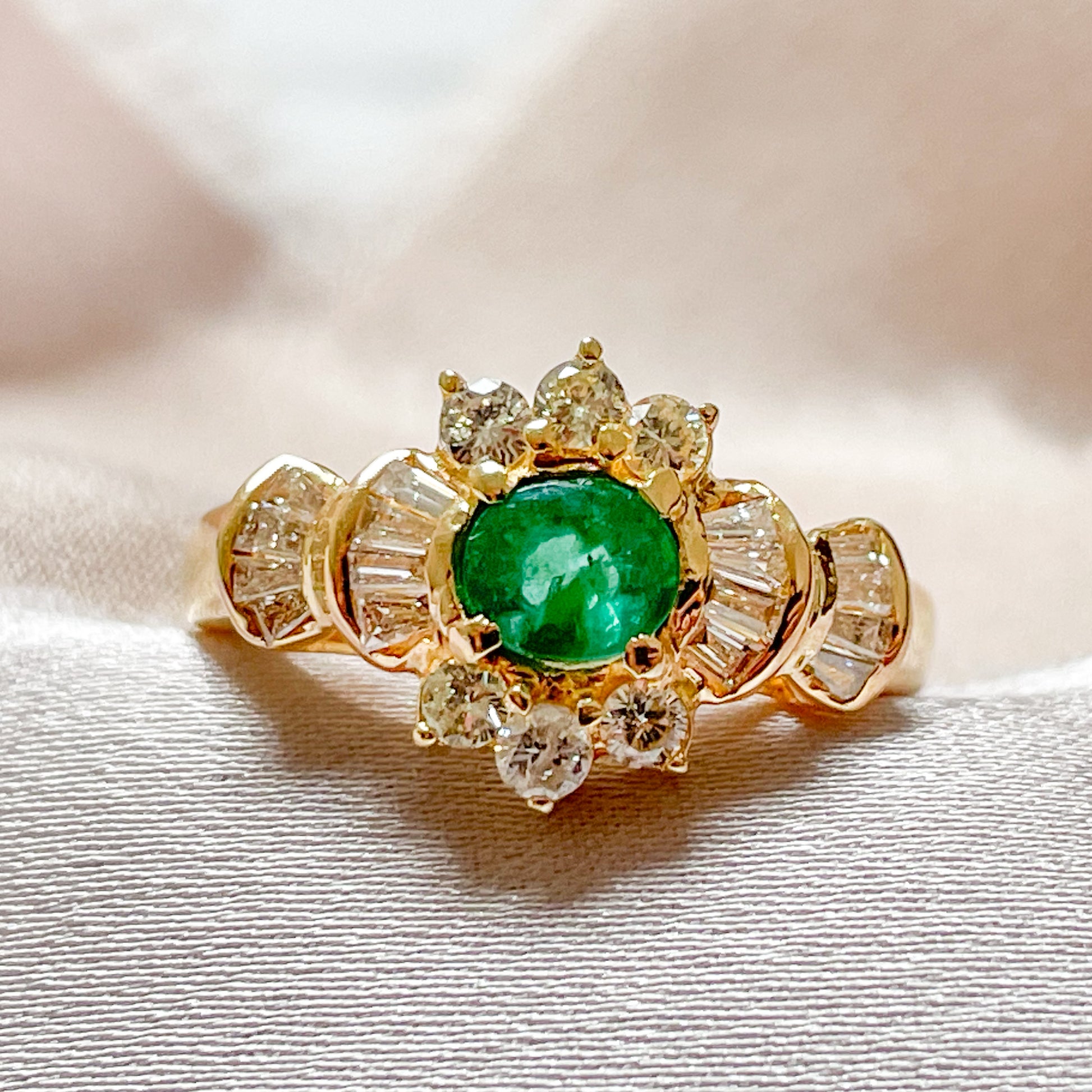 Esme is our 14k yellow gold ring, gracefully cradling a 0.5ct emerald that glows with quiet, captivating intensity. Surrounded by shimmering diamonds, the rich, centre green stone holds its own: bold, serene, and simply impossible to ignore. The setting and design of this ring almost emits a certain vintage soul with an eternal, everlasting glow.